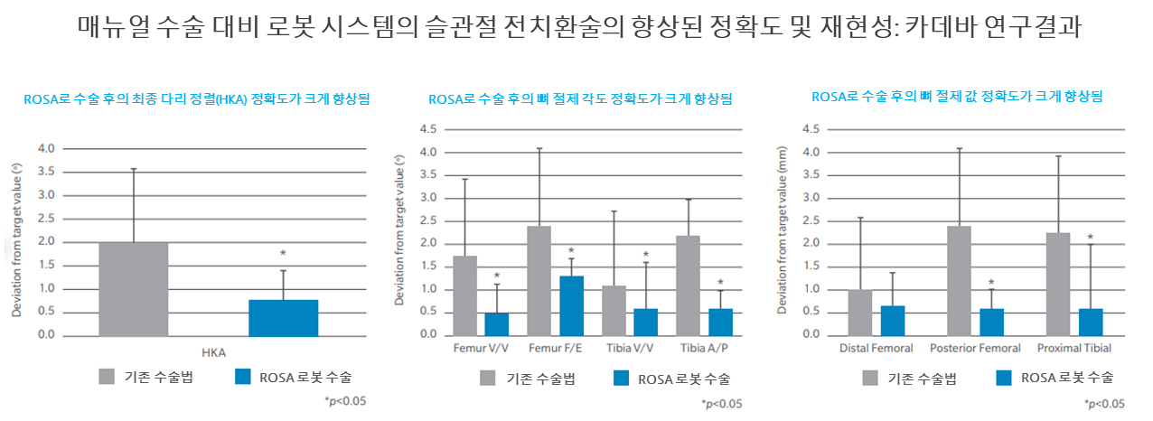 기존 무릎전치환술 기구를 사용한 수술과 로봇수술을 비교한 카데바 연구에 따르면, 전통적 방식으로 진행된 무릎수술의 25%에서 ±3°각도의 정렬 오차가 있던 반면, ROSA Knee 로봇 수술을 통한 모든 로봇 사례들은 사전계획된 각도 정렬값과 비교하여 오차범위가 ±3° 이내였습니다.
